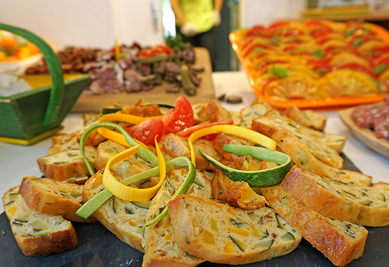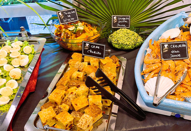 - 7 déjeuners (buffets d’entrées, 2 plats au choix, légumes, plateau de fromages, 2 desserts au choix, eau, rosé et rouge, café) à volonté.